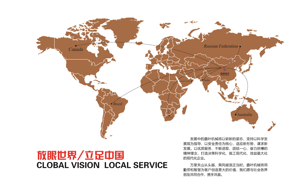 多年來公司始終堅持以人為本、以質(zhì)量求生存、以科技作動力、以創(chuàng)新促發(fā)展、以服務(wù)謀效益的經(jīng)營理念。矢志耕耘,追求卓越,止于至善的企業(yè)精神,創(chuàng)造需求,服務(wù)社會為鑫葉機械走向世界奠定堅實的基礎(chǔ)。